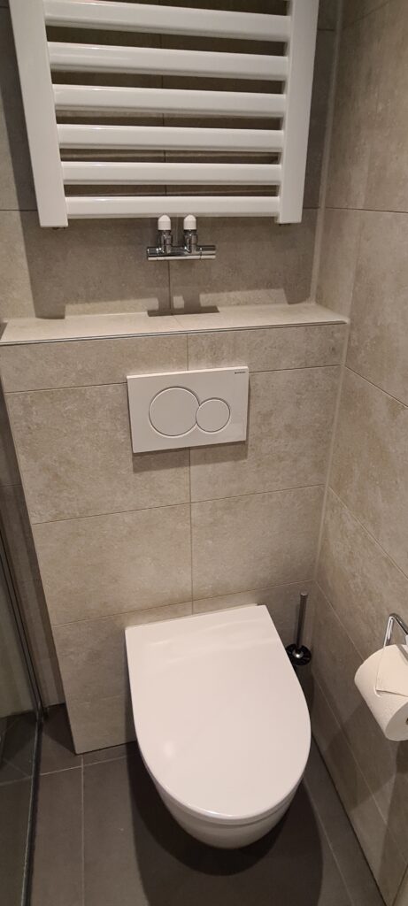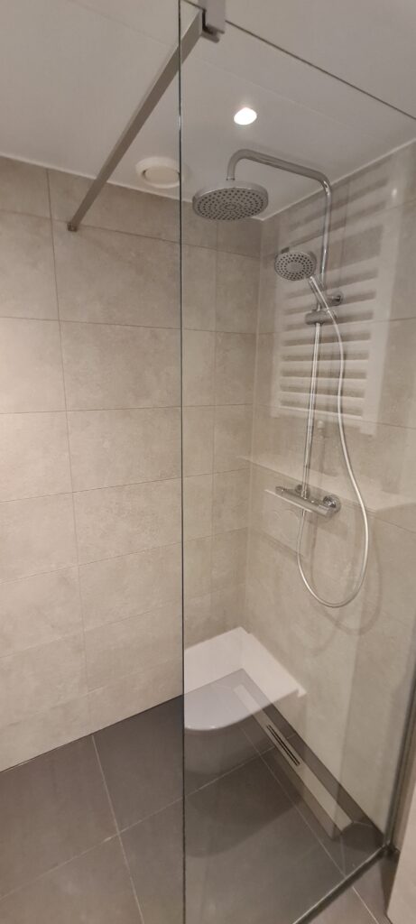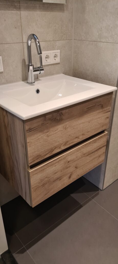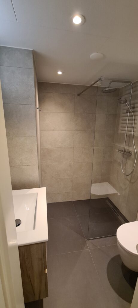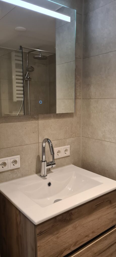 De renovatie van de eerste badkamer ( appartement) is klaar, zie bijgaande foto’s.